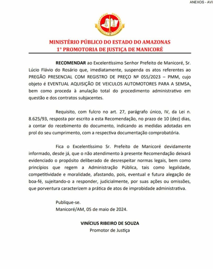 Amazonas – O Ministério Público do Estado do Amazonas (MPAM) está investigando um caso de possível corrupção na cidade de Manicoré, localizada a 331 quilômetros de Manaus. O alvo da investigação é a gestão do prefeito Lúcio Flávio (PSD), em relação ao Pregão Presencial com Registro de Preços nº 055/2023, que tinha como objetivo a compra de veículos para a Secretaria Municipal de Saúde (Semsa).