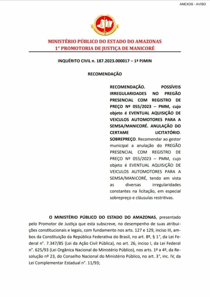 O MPAM, por meio do Inquérito Civil nº 187.2023.000017, identificou diversas irregularidades no processo licitatório, incluindo sobrepreço e cláusulas restritivas. Diante desses achados, o órgão emitiu uma Recomendação exigindo a anulação imediata do pregão, alertando que o descumprimento poderá resultar em consequências legais severas para o prefeito e seu governo.