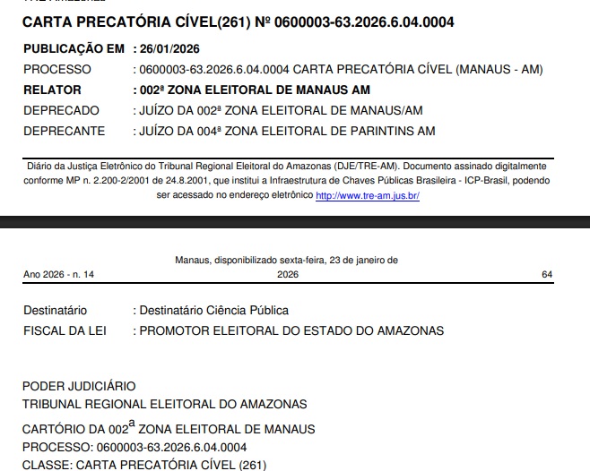 A decisão, publicada no Diário da Justiça Eletrônico do TRE-AM nesta segunda-feira, 26 de janeiro de 2026, atende a uma Carta Precatória expedida pela 4ª Zona Eleitoral de Parintins e foi proferida pelo juiz eleitoral da 2ª Zona Eleitoral de Manaus, Antônio Itamar de Sousa Gonzaga.