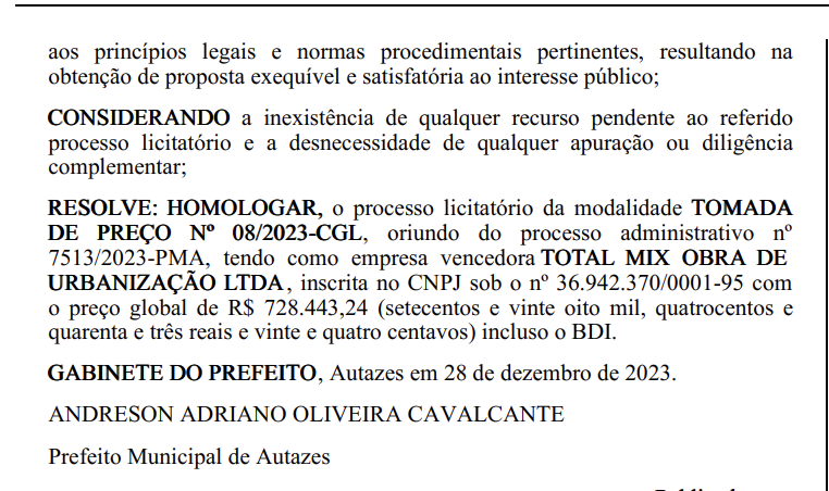 A empresa vencedora do certame, Total Mix Obra de Urbanização Ltda, inscrita no CNPJ sob o nº 36.942.370/0001-95, foi agraciada com o contrato, sob a justificativa de que apresentou o melhor preço global, incluso o Benefício e Despesas Indiretas (BDI).