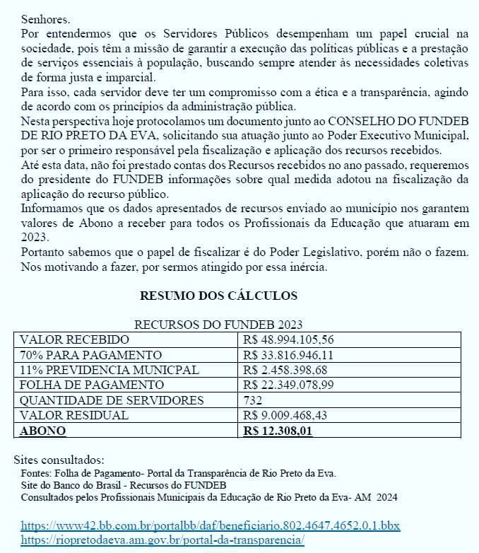 Um documento assinado por mais de 30 profissionais exige que o prefeito apresente evidências dos valores que deveriam ser distribuídos conforme a Lei do Fundeb. Os professores também solicitaram explicações ao presidente do Conselho do Fundeb sobre as medidas de fiscalização dos R$ 8 milhões recebidos.