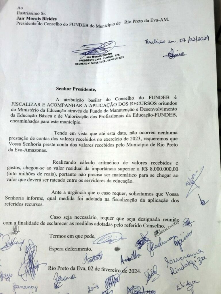 Documentos protocolados em 2 de fevereiro de 2024 junto ao presidente do Conselho do FUNDEB de Rio Preto da Eva, Jair Morais Bleides, mostram que Anderson Sousa recebeu cerca de R$ 8 milhões em 2023, sem prestar contas desses valores.
