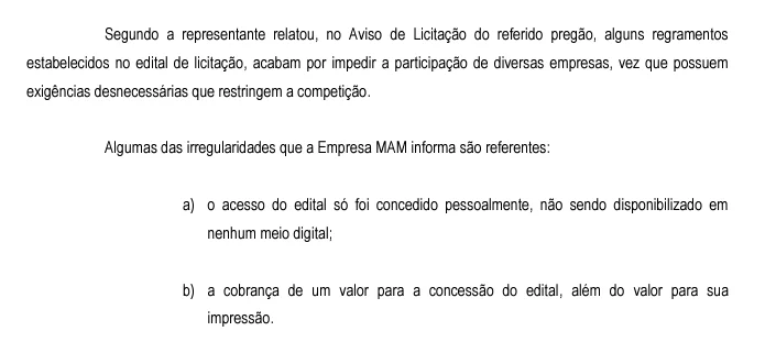 De acordo com a representação, o edital da licitação apresentava cláusulas que comprometem a ampla concorrência, violando princípios fundamentais de isonomia e competitividade. Entre as irregularidades denunciadas estão a exigência de retirada presencial do edital, sem disponibilização em meio digital, e a cobrança de valores para obtenção e impressão do documento. Tais condições, segundo a empresa, restringem a participação de diversos fornecedores, comprometendo a transparência e a lisura do processo.