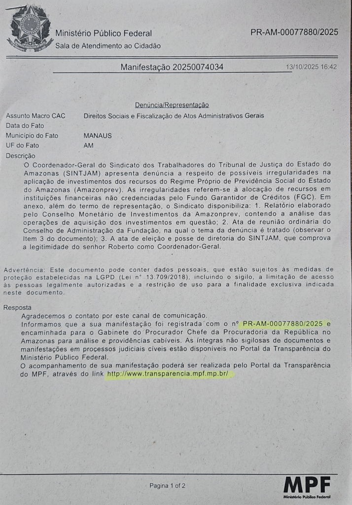 Segundo o Sintjam, as irregularidades ocorreram entre junho e setembro de 2024, envolvendo aplicações em Letras Financeiras dos bancos C6 e Master, realizadas sem consulta ao Conselho Fiscal da Amazonprev e sem análise formal de risco.