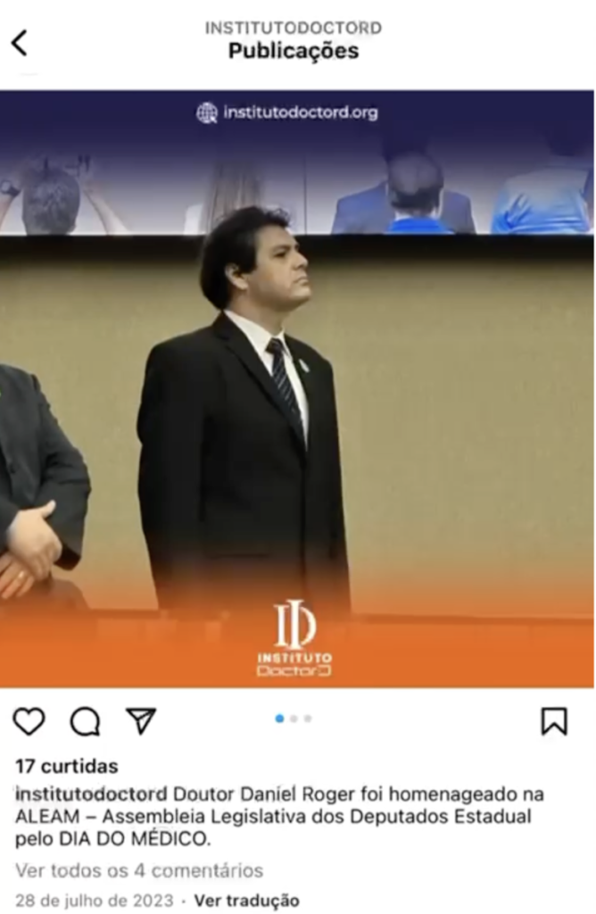 Vale ressaltar, que apesar das polêmicas e a conduta questionável, o Dr. Daniel Roger já recebeu homenagens da Assembléia Legislativa do Estado do Amazonas (ALEAM-AM), conforme disponibilizado nas redes sociais do Instituto Doctor D.