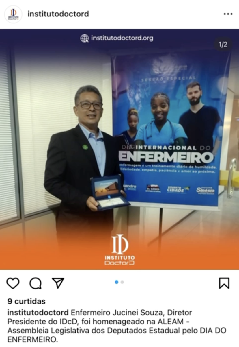 O enfermeiro Jucinei Souza Silva, que assim como o médico Daniel Roger Goulart Silva, foi homenageado na ALEAM, no Dia do Enfermeiro. Ele aparece como presidente do Instituto Doctor D e já virou manchete em sites de notícias por ter atrasado salários de funcionários terceirizados do Hospital Adriano Jorge.