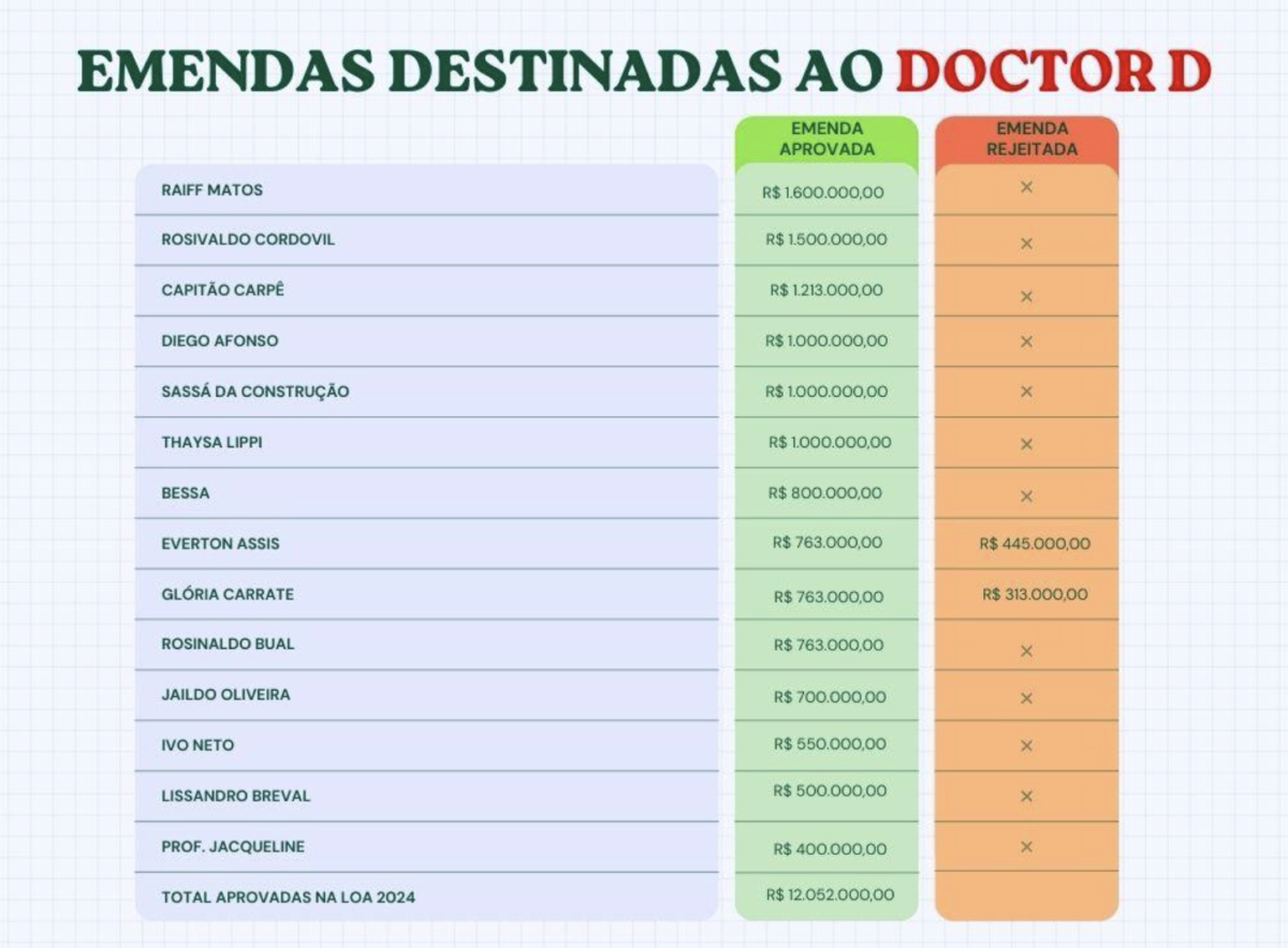 Da lista divulgada acima apenas Lissandro Breval teria assinado um memorando, ainda em dezembro do ano passado, para cancelar a sua emenda que destinava R$500 mil ao Doctor D.