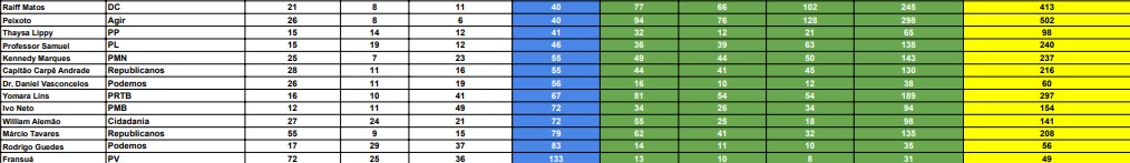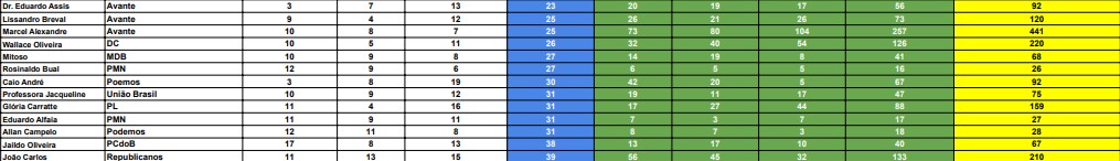 Excluídos desta avaliação, os vereadores Amauri Colares (Avante), Gilmar Nascimento (Avante) e Roberto Sabino (Podemos), que não contabilizaram três anos completos de mandato.