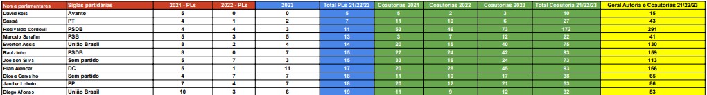 Outros parlamentares, como Professora Jacqueline (União Brasil), Glória Carratte (PL), Eduardo Alfaia (PMN) e Allan Campello (Podemos), apresentaram 31 PLs cada; Jaildo Oliveira (PCdoB), 38; e João Carlos (Republicanos), 39.