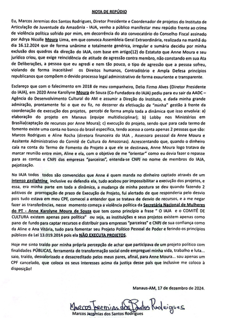 Em um trecho de sua nota, Rodrigues afirma que foi “traído” pela própria percepção de que estava participando de um projeto de transformação social, no qual investiu sua vida e trabalho. “Saio desvalorizado e desacreditado pelos meus pares, e para Anne Moura sou apenas um CPF cancelado, que não se encaixou nos seus interesses pessoais”, desabafou o ex-presidente do IAJA.