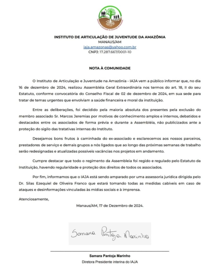 Por outro lado, a atual diretoria do IAJA, sob a presidência interina de Samara Pantoja Marinho, divulgou uma nota explicando a decisão de expulsão de Marcos Rodrigues. A nota, assinada por Samara, alega que a expulsão foi baseada em motivos de “conhecimento amplo e interno” e que a decisão foi tomada de forma legítima e regida pelo estatuto do instituto. No entanto, a nota não especifica quais seriam os “motivos internos” que levaram à exclusão de Rodrigues, o que tem gerado ainda mais especulação sobre a situação.