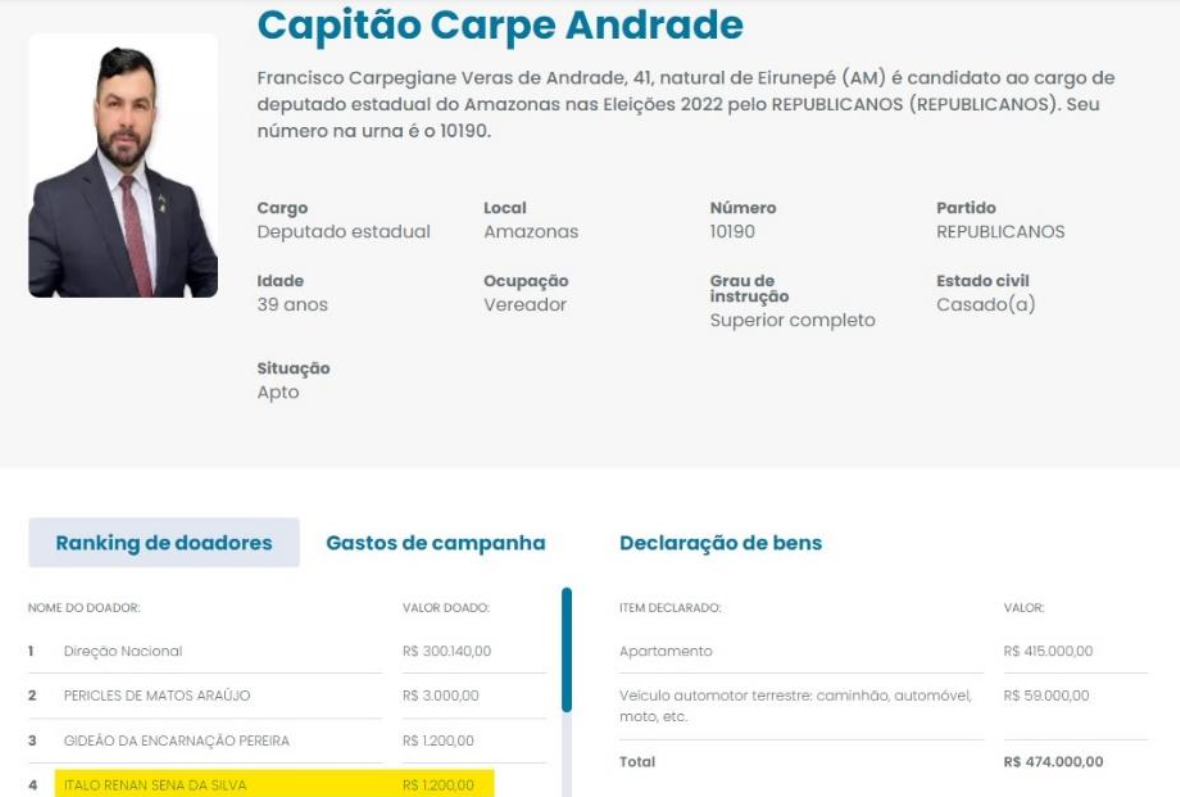 Ele aparece como doador para a campanha do vereador Carpê para deputado estadual em 2022. Renan na época já era funcionário do vereador Carpê e o valor doado corresponde a 50% da sua remuneração.