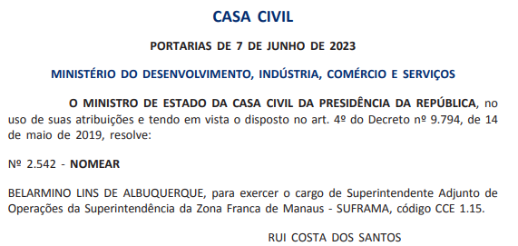 A nomeação do político foi assinada pelo ministro da Casa Civil, Rui Costa, e publicada no Diário Oficial da União nesta segunda-feira (12). Com ampla experiência na política regional, Lins traz consigo um vasto conhecimento sobre as questões relacionadas à Zona Franca de Manaus, tornando-o uma escolha significativa para o cargo. Veja: