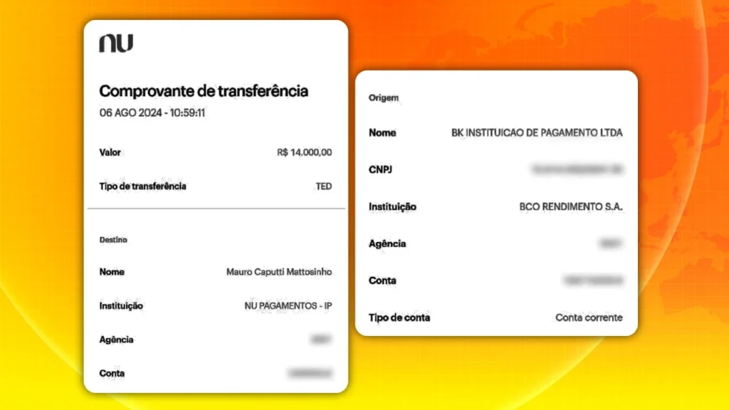 Os depósitos foram feitos pela BK Instituição de Pagamento S.A., também conhecida como BK Bank. Apenas entre abril e agosto de 2024, foram transferidos R$ 58,3 mil para a conta pessoal do piloto.