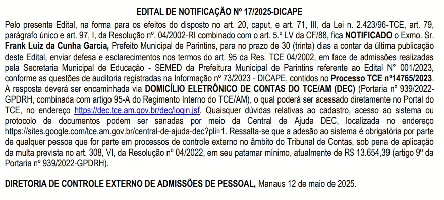 Amazonas – O ex-prefeito de Parintins, Frank Luiz da Cunha Garcia, mais conhecido como Bi Garcia, está na mira do Tribunal de Contas do Estado do Amazonas (TCE-AM). Ele recebeu uma notificação para dar explicações sobre contratações feitas na Secretaria Municipal de Educação (SEMED) durante seu mandato. O aviso saiu no Edital nº 17/2025-DICAPE, assinado pela Diretoria de Controle Externo de Admissões de Pessoal.