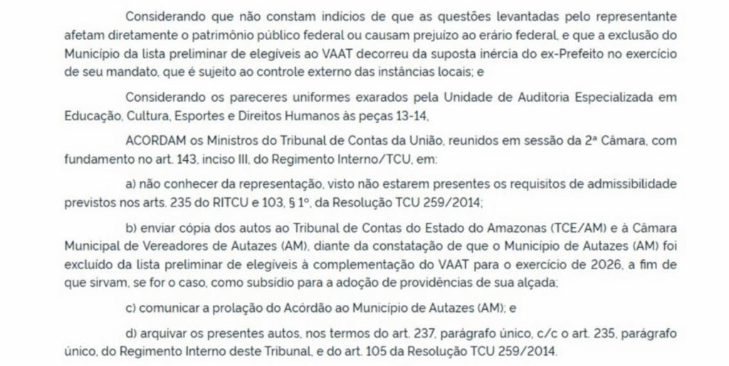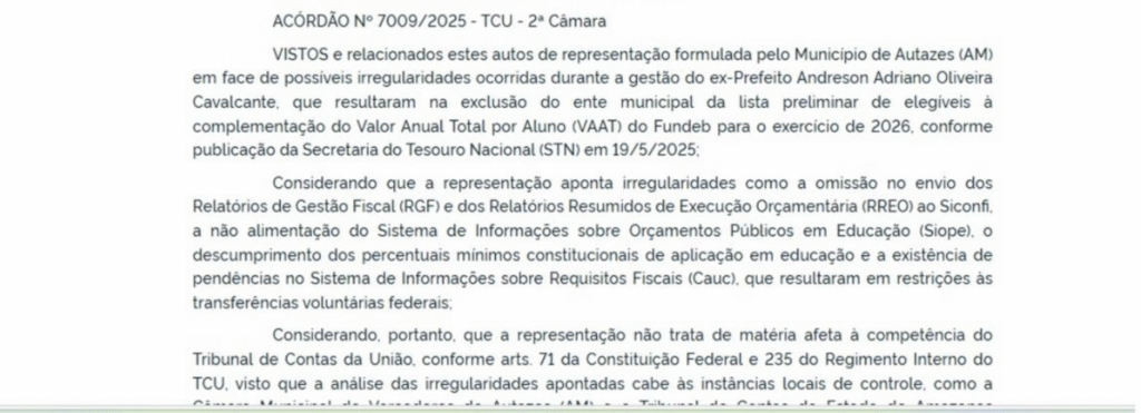 Amazonas – O Tribunal de Contas da União (TCU) confirmou que a gestão do ex-prefeito de Autazes, Andreson Cavalcante, cometeu omissões graves que custaram caro ao município. A falta de envio dos relatórios fiscais obrigatórios, a não alimentação do Siope e as pendências no Cauc deixaram Autazes fora da lista preliminar do VAAT do Fundeb para 2026 — um corte direto no dinheiro destinado às escolas e aos estudantes.