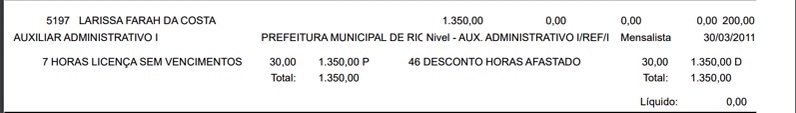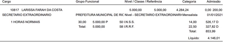 Além disso, Larrissa Farah acumula dois cargos na Prefeitura Municipal de Rio Preto da Eva, uma como Auxiliar Administrativa, recebendo R$ 1.350, e outra como Secretária Extraordinária, recebendo R$ 5 mil.