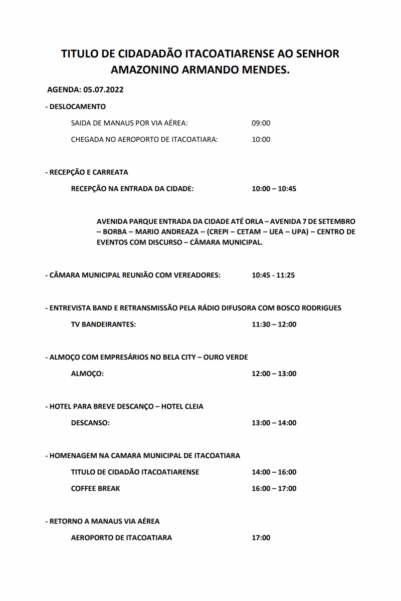 Acompanhado do ex-Secretário de Segurança Pública do Amazonas, Coronel Amadeu Soares, do atual Presidente da Federação Amazonense de Futebol, Ednailson Rozenha e do ex-deputado federal Humberto Michiles, Amazonino desembarcou no aeroporto da cidade e seguiu para uma carreata, em seguida para uma reunião com os vereadores do município.