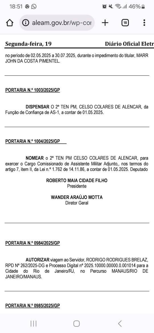 Na Portaria nº 1003/2025/GP, Celso foi exonerado da função de confiança de AS-1, e, no mesmo dia, foi imediatamente nomeado para um cargo ainda mais relevante: Assistente Militar Adjunto, conforme a Portaria nº 1004/2025/GP. A nova função é de maior confiança dentro da estrutura da Aleam, ligada diretamente à presidência do Legislativo estadual, indicando proximidade e influência direta junto ao deputado Roberto Cidade.