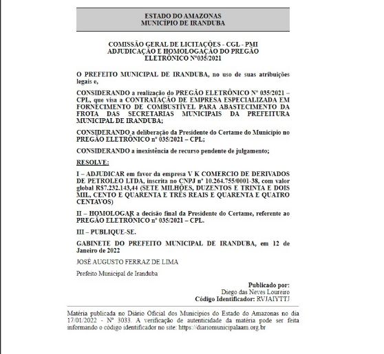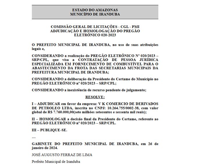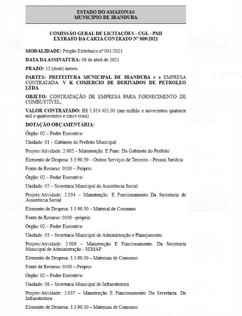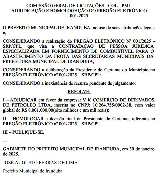 A empresa, que opera com o fornecimento de derivados de petróleo, tem sido a principal beneficiada nos certames realizados pela Comissão Geral de Licitações de Iranduba, sempre recebendo a adjudicação e homologação de valores expressivos sem concorrência aparente ou impugnações.