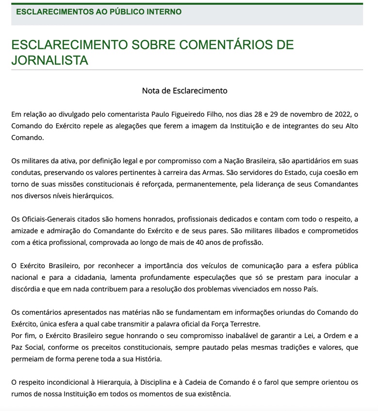 Nesta terça-feira (29), o General Villas Boas emitiu nota nesta terça-feira (29) chamando o informação de Paulo Figueiredo de “Fake News. Mais tarde, uma nota do Exército Brasileiro também saiu em defesa dos generais e chamou o conteúdo de “especulações que só se prestam para inocular a discórdia”.