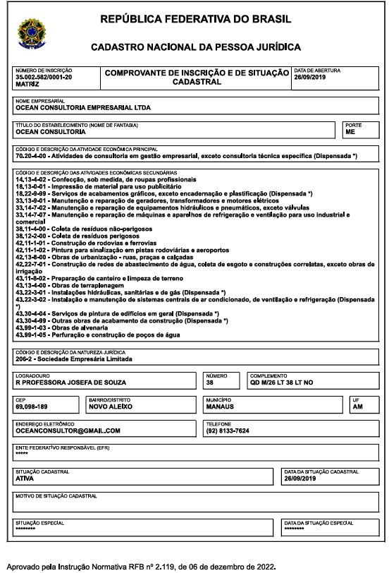 Embora carregue “Consultoria Empresarial” no nome, a Ocean é o que o mercado chama de “empresa pato”: faz de tudo, mas nada direito. O Cadastro Nacional de Pessoa Jurídica (CNPJ) da empresa revela um verdadeiro “balaio de gato” de atividades.