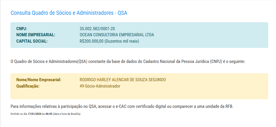 A beneficiária da bolada é a OCEAN CONSULTORIA EMPRESARIAL LTDA (CNPJ 35.002.582/0001-20), de propriedade de Rodrigo Harley Alencar de Souza Segundo. O que chama atenção, no entanto, não é apenas o valor, mas a natureza da empresa e a velocidade dos pagamentos.