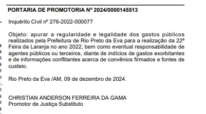 O primeiro inquérito, de n.º 276-2022-000077, busca apurar possíveis irregularidades nos gastos públicos realizados pela Prefeitura durante a 22ª Feira da Laranja, em 2022. A portaria foi assinada pelo promotor de Justiça substituto, Christian Anderson Ferreira da Gama, e publicada no Diário Oficial do MPAM.