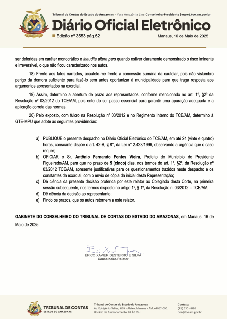 Amazonas – O prefeito de Presidente Figueiredo, Fernando Vieira (PL), enfrenta questionamentos do Tribunal de Contas do Amazonas (TCE-AM) sobre supostas irregularidades no Credenciamento nº 007/2025, destinado à contratação de médicos generalistas e especialistas para o Sistema Único de Saúde (SUS) no município, localizado a 119 km de Manaus. O TCE-AM determinou que a prefeitura apresente explicações em cinco dias, conforme decisão publicada no Diário Oficial da Corte na sexta-feira (16/5).