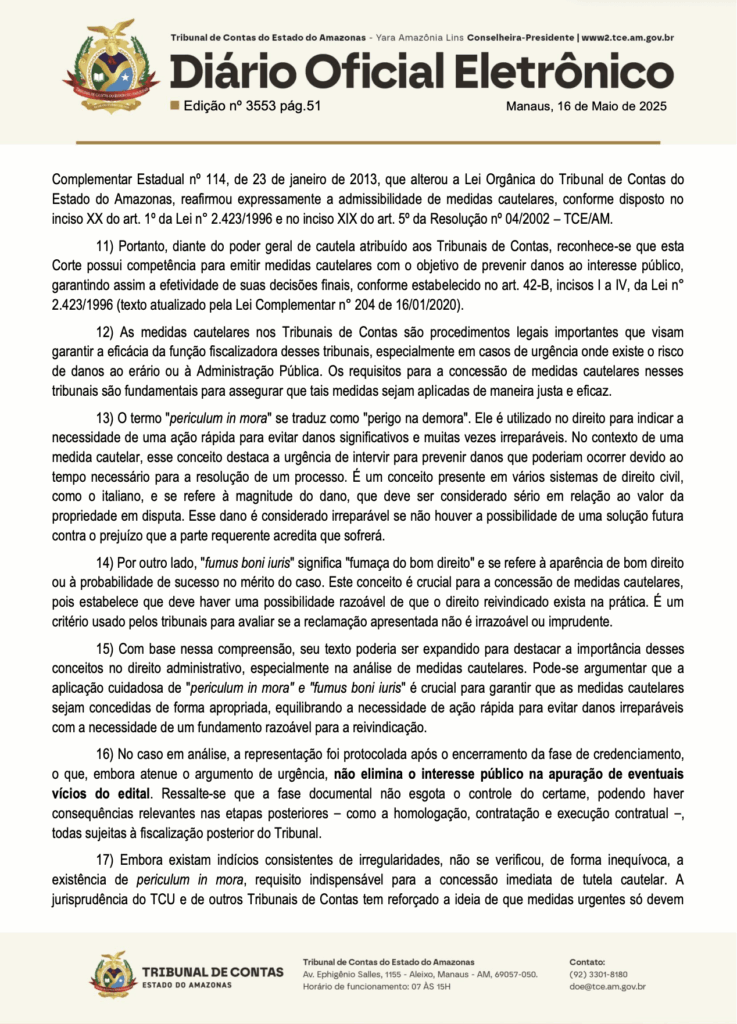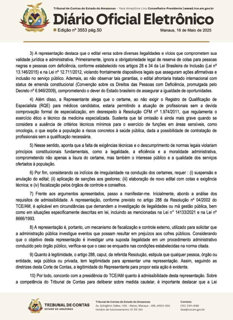 O conselheiro Érico Desterro, relator do processo, determinou que a prefeitura se manifeste em cinco dias sobre as acusações, que apontam desrespeito a normas constitucionais, infraconstitucionais e tratados internacionais. A ausência de cotas e a não exigência de qualificações específicas levantam preocupações sobre a legalidade do certame e a qualidade do serviço de saúde oferecido. Vale lembrar que o prazo para responder o TCE-AM termina nesta quarta-feira (21/5).