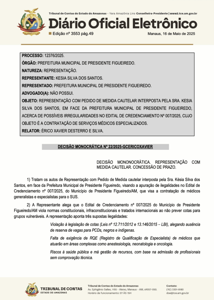 O chamamento público, realizado entre 22 e 30 de abril de 2025, abriu vagas para profissionais como cardiologistas, ginecologistas e pediatras nas Unidades Básicas de Saúde (UBS) de Presidente Figueiredo. Contudo, uma representação protocolada no TCE-AM aponta três irregularidades graves: