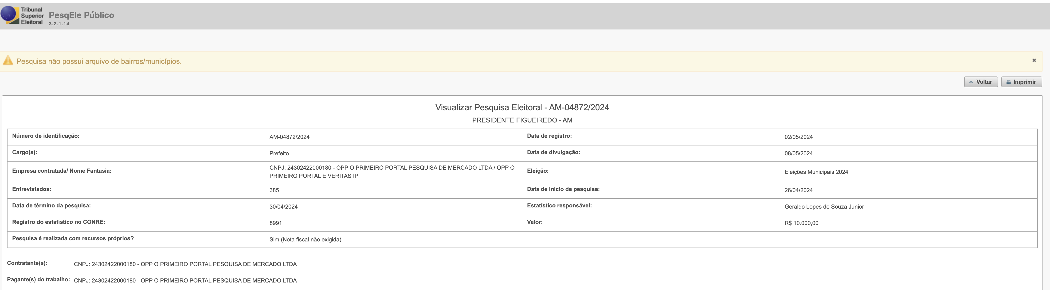 A pesquisa conduzida pelo Iveritas Instituto de Pesquisa seguiu todas as diretrizes estatísticas exigidas, ouvindo presencialmente 385 eleitores no mês de abril, durante o período de 26/04/2024 a 30/04/2024. O nível de confiança estimado é de 95% e a margem de erro máxima prevista, baseada em uma amostra aleatória simples (AAS), é de cerca de 5 pontos percentuais para mais ou para menos em relação aos totais da amostra.