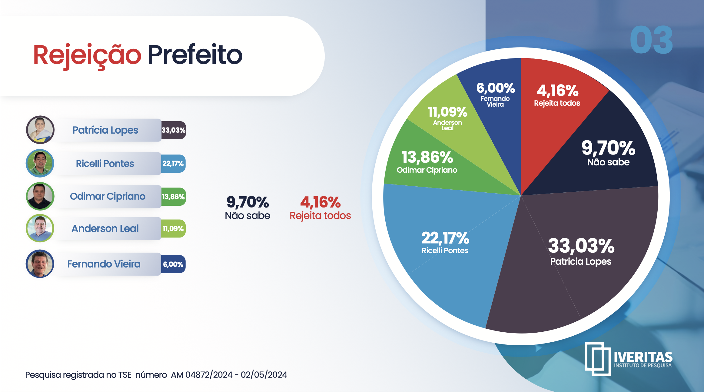 A atual prefeita de Presidente Figueiredo, Patrícia Lopes, da UB, aparece como a principal oponente de Vieira, mas com uma diferença substancial nas intenções de voto: 24,02% na modalidade estimulada e 19,63% na espontânea. Em terceiro lugar, figura Ricelli Pontes, com 10,85% e 6,24%, respectivamente.