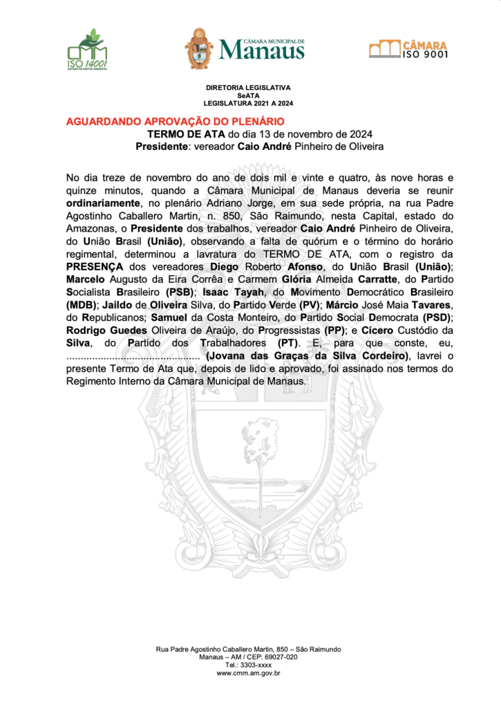 Os únicos vereadores que marcaram presença no plenário foram Diego Roberto Afonso (União Brasil), Marcelo Augusto da Eira Corrêa e Carmem Glória Almeida Carratte (PSB), Isaac Tayah (MDB), Jaildo de Oliveira Silva (PV), Márcio José Maia Tavares (Republicanos), Samuel da Costa Monteiro (PSD), Rodrigo Guedes Oliveira de Araújo (Progressistas) e Cícero Custódio da Silva (PT). Para o restante dos 31 ausentes, a justificativa ainda é desconhecida, mas a frequência de faltas tem sido constante e já não surpreende a população.