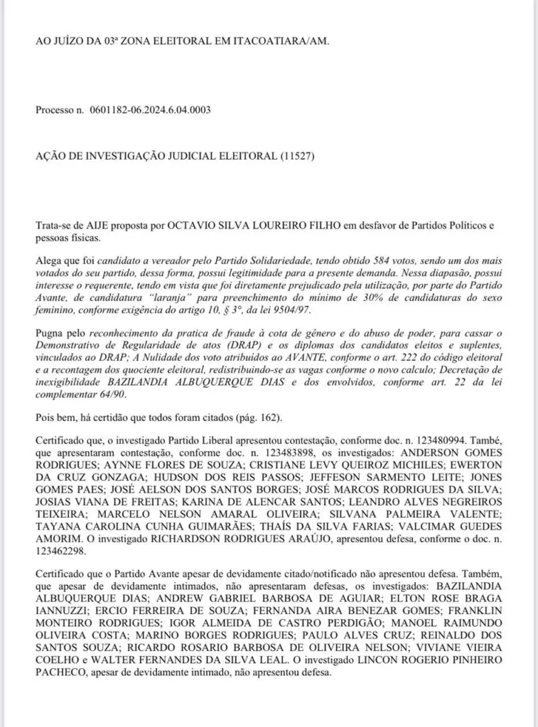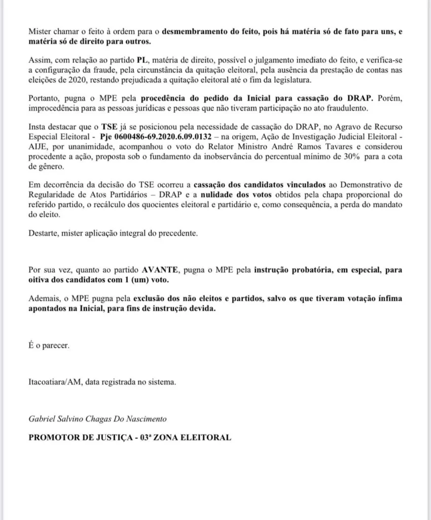 Amazonas – O cenário político de Itacoatiara, a 270 km de Manaus, pode sofrer uma reviravolta nos próximos meses. O Ministério Público Eleitoral (MPE) emitiu parecer favorável à cassação das chapas proporcionais dos partidos PL e Avante por suspeitas de fraude à cota de gênero e ausência de prestação de contas nas eleições de 2020. Se a Justiça acolher o pedido, os vereadores Richardson do Mutirão (PL) e Badi Pacheco (Avante) podem perder os mandatos conquistados no pleito municipal.