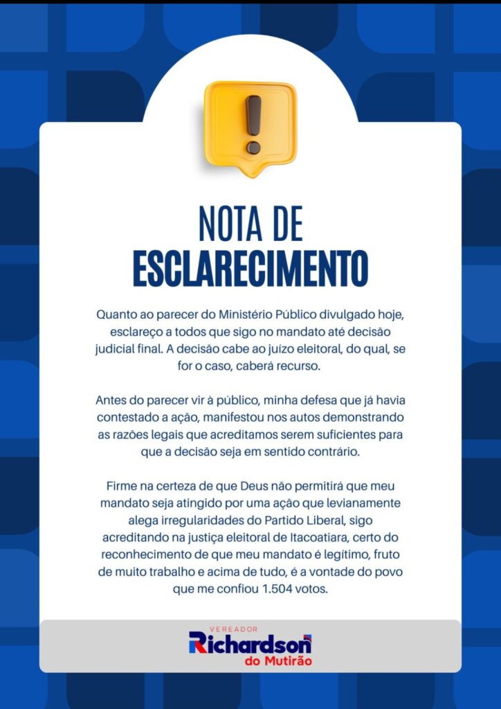 O vereador Richardson do Mutirão se manifestou publicamente nas redes sociais, afirmando que já apresentou sua defesa e confia na Justiça Eleitoral do Amazonas. Em nota, declarou:
