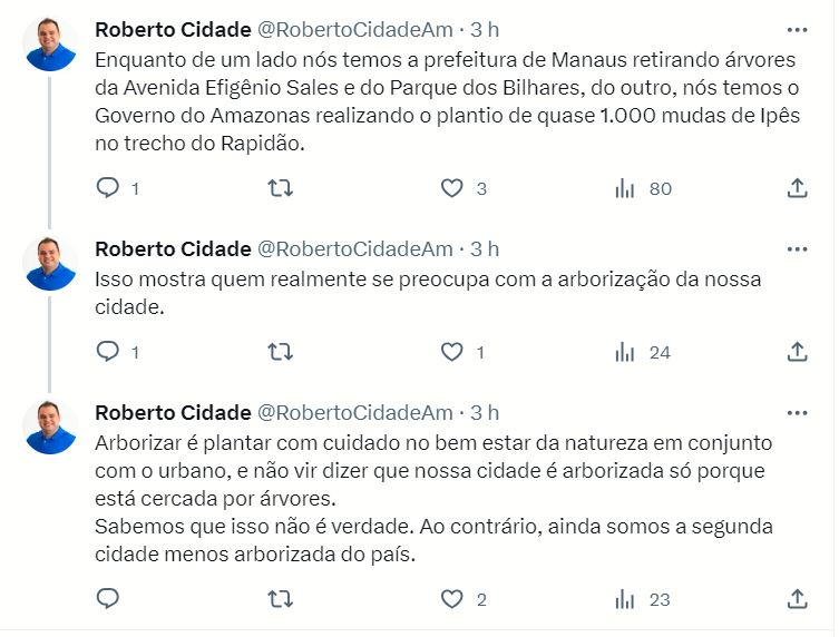 “Enquanto de um lado nós temos a prefeitura de Manaus retirando árvores da Avenida Efigênio Sales e do Parque dos Bilhares, do outro, nós temos o Governo do Amazonas realizando o plantio de quase 1.000 mudas de Ipês no trecho do Rapidão. Isso mostra quem realmente se preocupa com a arborização da nossa cidade. Arborizar é plantar com cuidado no bem estar da natureza em conjunto com o urbano, e não vir dizer que nossa cidade é arborizada só porque está cercada por árvores. Sabemos que isso não é verdade. Ao contrário, ainda somos a segunda cidade menos arborizada do país”, escreveu o deputado no X, antigo Twitter.