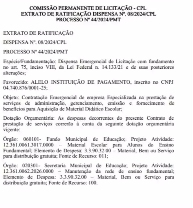 De acordo com a documentação, o contrato estipula que a Alelo deverá administrar, gerenciar, emitir e fornecer benefícios para a aquisição de materiais escolares. No entanto, a falta de um histórico na área levantou questões que requerem respostas claras das autoridades competentes.