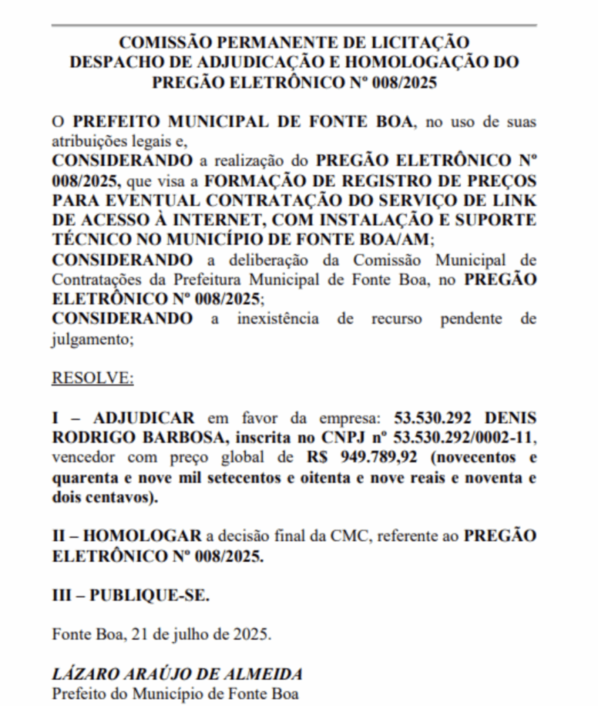 O prefeito Dr. Lázaro, autorizou a contratação de uma microempresa para fornecimento de link de internet ao custo de R$ 949.789,92. O contrato foi formalizado por meio do Pregão Eletrônico nº 008/2025, publicado no Diário Oficial dos Municípios.