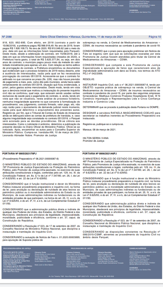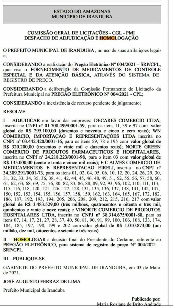 Na época, a Prefeitura de Iranduba havia firmado um contrato para o “fornecimento de medicamentos de controle especial e da atenção básica”, com valores que ultrapassaram R$ 5,2 milhões.
