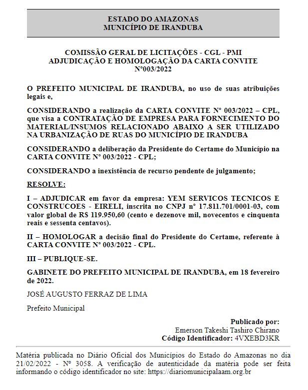 Também em 2022, a Prefeitura de Iranduba foi alvo do Ministério Público do Amazonas (MPAM), que instaurou Inquérito Civil para investigar possíveis irregularidades em um pregão eletrônico. A licitação, estimada em quase R$ 120 mil, teria favorecido uma gráfica sediada em Manaus.