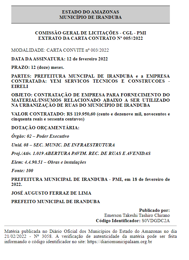 Os serviços, segundo a publicação, devem ser realizados no distrito do Cacau Pirera, localizado no município de Iranduba. Ao todo, o valor que será gasto pela prefeitura é de R$ 19.313.700,30 (dezenove milhões trezentos e treze mil, setecentos reais e trinta centavo).