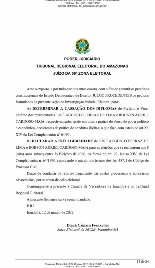 Além da cassação dos diplomas de Augusto Ferraz e Robson Adriel, a Justiça Eleitoral também declarou os dois inelegíveis por oito anos.