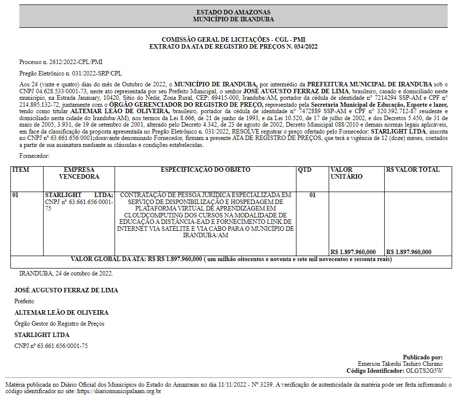 Na época, o que chamou a atenção foi que a empresa contratada pela Prefeitura de Iranduba era especialista em fabricação de artefatos de cimento, no entanto, fechou o acordo para a prestação de serviços de hospedagem de plataforma virtual.