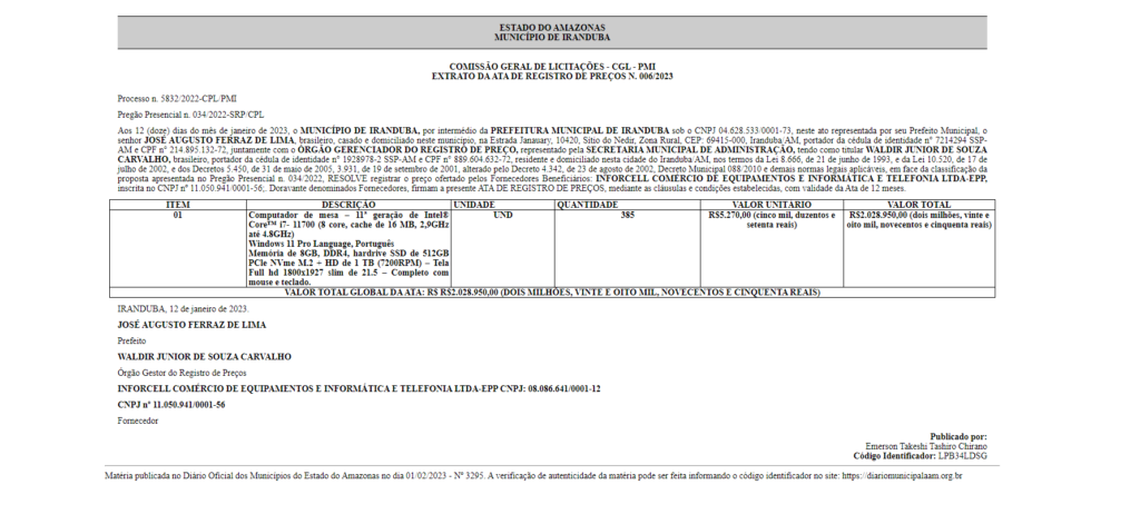 Em 2023, mais precisamente em março, outro serviço para o ‘parque tecnológico’ foi contratado por Iranduba, este custou mais de R$ 2 milhões e tinha como objetivo a compra de 385 computadores.