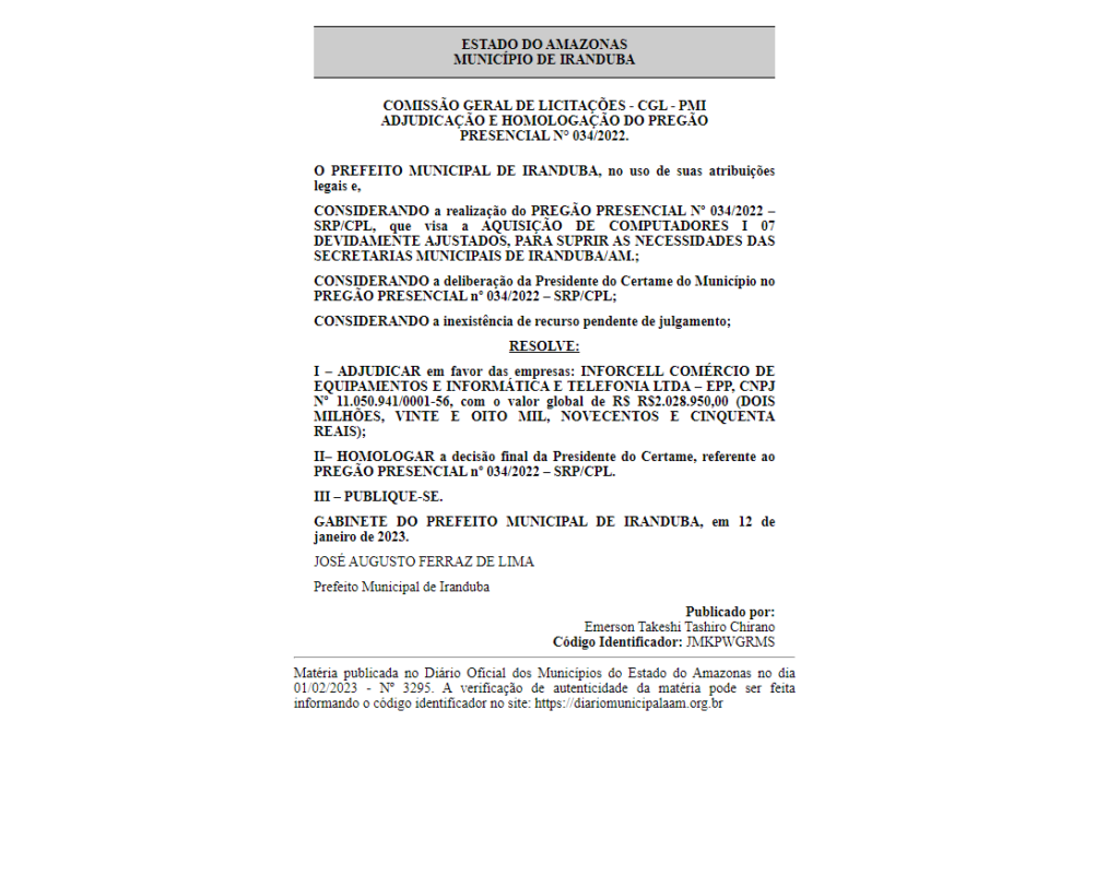 Vale pontuar que, na época, a prefeitura de Iranduba não constava no Portal de Acesso à Informação e Transparência dos municípios do Estado do Amazonas (consulta realizada no dia 3/3/2023). Foi verificado que o site da prefeitura estava fora do ar.
