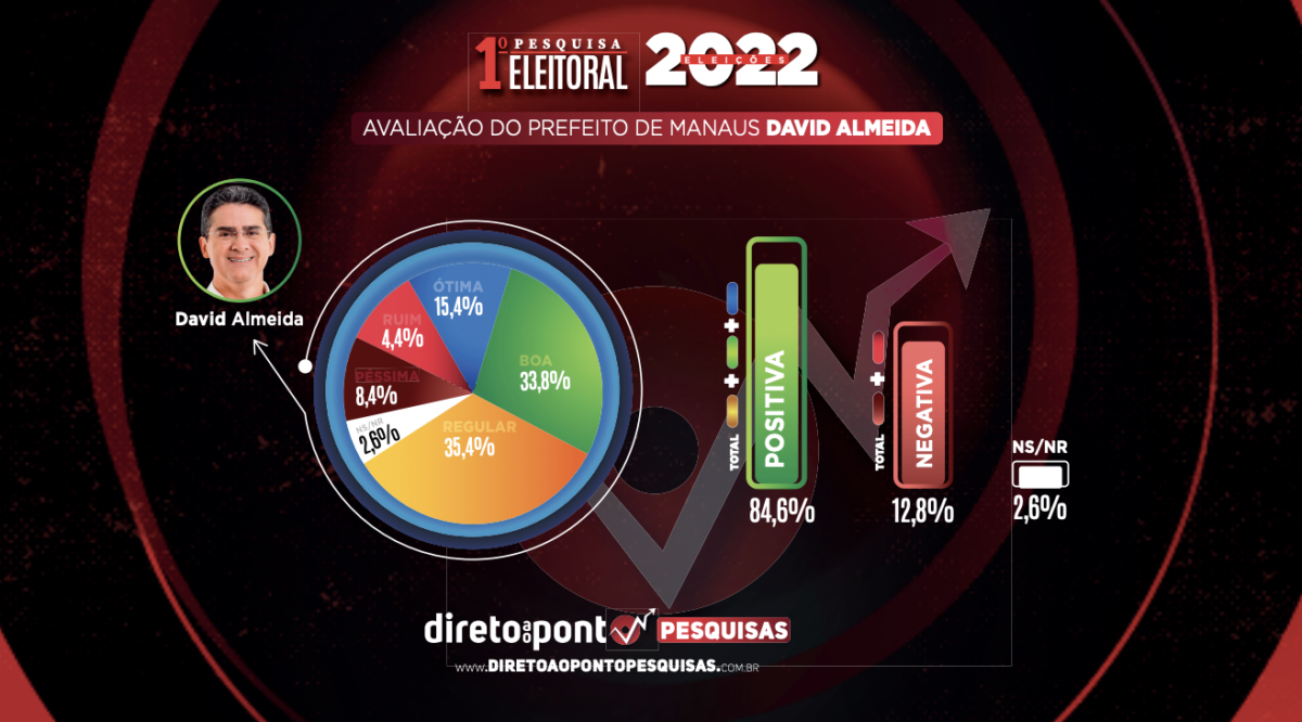 Manaus – O prefeito de Manaus, David Almeida (Avante), entra na reta final do seu segundo ano de administração com uma gestão bem avaliada por 84,6% (ótimo, bom e regular) da população, de acordo com dados do Direto ao Ponto Pesquisas, divulgados nesta quarta-feira (31). Outros 12,8% (ruim e péssimo) avaliaram como negativa a gestão municipal, enquanto 2,6% dos eleitores não souberam ou não quiseram opinar sobre o assunto.