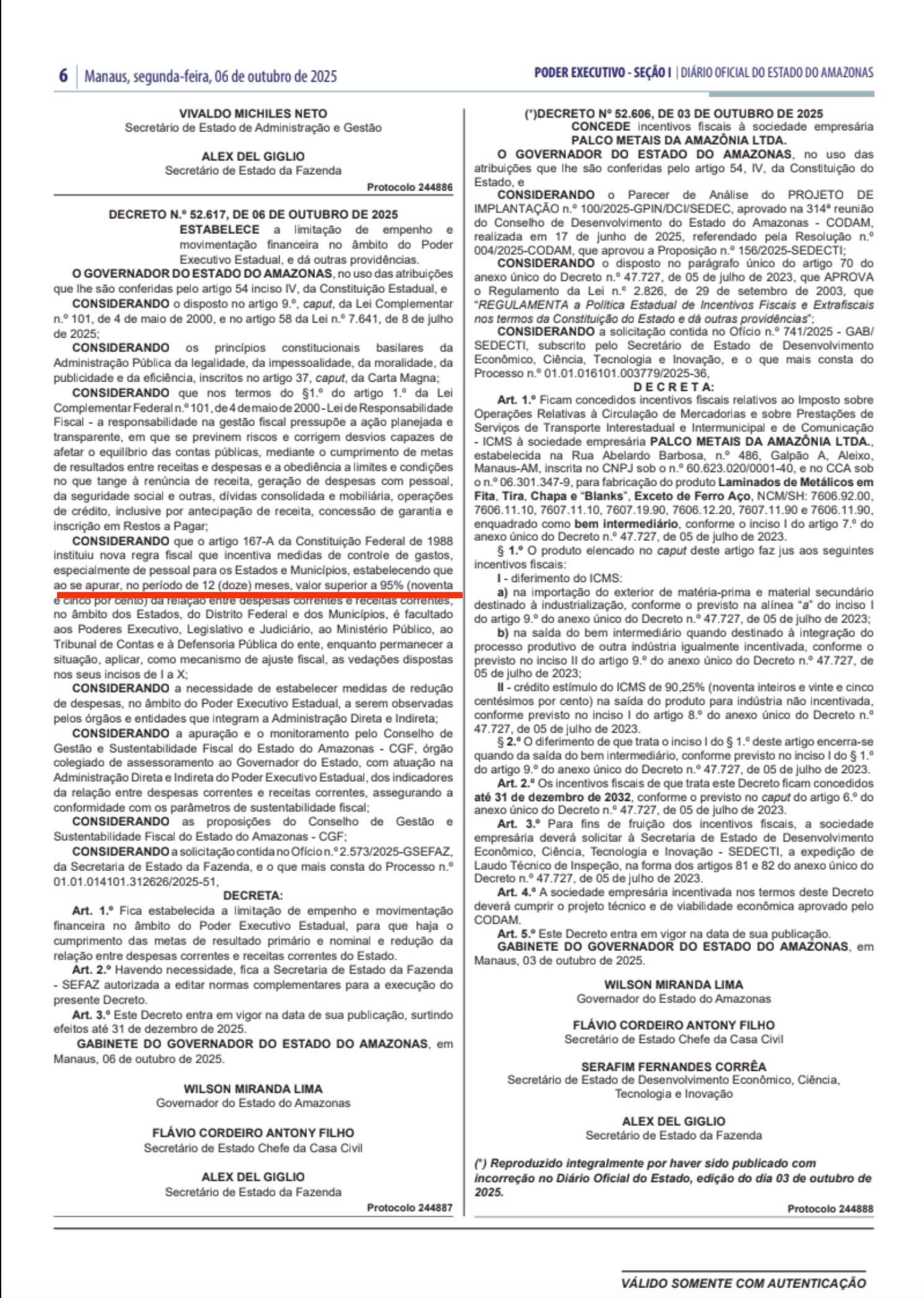 Documentos oficiais mostram que o Amazonas ultrapassou o limite constitucional de 95% de gastos com despesas correntes, atingindo 96,85% da receita — situação que colocou o Estado sob alerta legal e obrigou o governo a restringir empenhos e movimentações financeiras por meio de decreto. O movimento acende o sinal do desequilíbrio fiscal e demonstra dificuldade para manter o funcionamento da máquina pública.