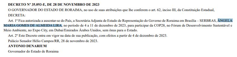 As autorizações para a viagem, que ocorre em meio ao conturbado processo de cassação, foram publicadas no Diário Oficial do Estado em 28 de novembro. A inclusão de Ângela Lira, secretária-adjunta da Representação do Governo em Brasília, na comitiva levanta questões sobre a escolha de membros para representar o governo estadual em um evento internacional de grande importância.