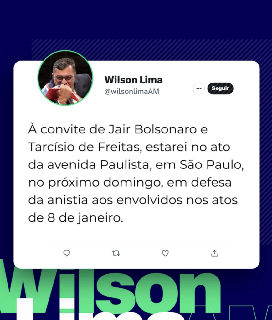 Em sua publicação, Wilson Lima declarou: “À convite de Jair Bolsonaro e Tarcísio de Freitas, estarei no ato da avenida Paulista, em São Paulo, no próximo domingo, em defesa da anistia aos envolvidos nos atos de 8 de janeiro.” A manifestação, que está marcada para as 14h, é mais um capítulo na série de eventos promovidos por lideranças bolsonaristas que buscam pressionar o Congresso Nacional a aprovar o chamado “PL da Anistia”, um projeto de lei que perdoaria os condenados pelos ataques antidemocráticos.